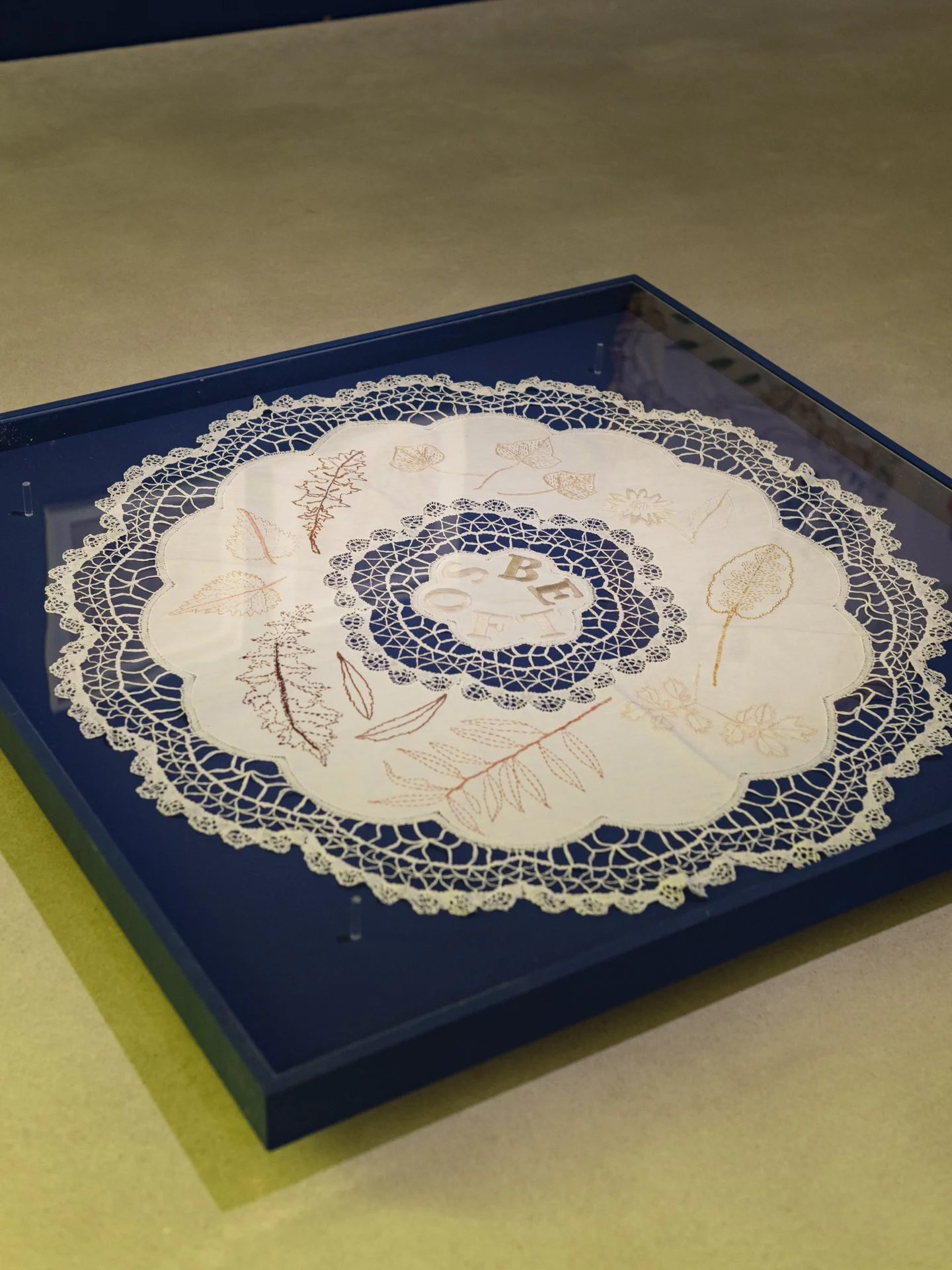 Be Soft. Unhurriedly created, Be Soft is a meditative work acknowledging the climate crisis as both external and internal. A strategy for feeling calm in its making, this circular work extends an invitation for slow-looking, reminiscent of and inspired by the bounty and sacrality of the living world and referencing plants growing outside of my temporary studio while on a 2023 residency at Stiftung Künstlerdorf Schöppingen, Germany.