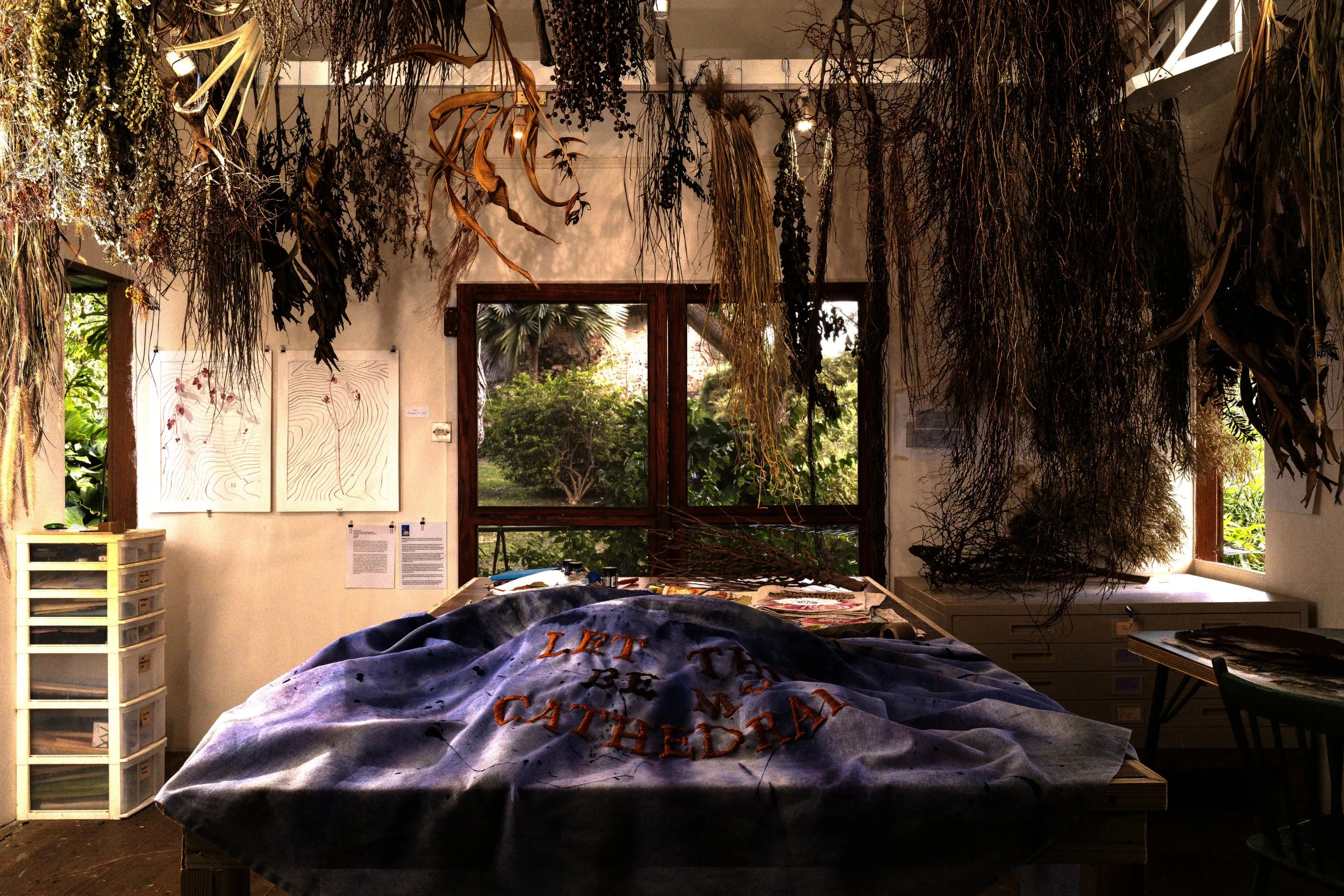 A multimedia installation anchored in ecological grief, colonial memory, and reverential acts, Let This Be My Cathedral offers a sanctum for critical meditation on biodiversity loss and the emotional and environmental residues of the plantationocene. Through a composite of organic material including fronds, leaves, inflorescences, seeds and pods, a to-scale lead cast of a now- extinct Eskimo curlew resting on a hand-embroidered and dyed shroud, a Damask covered seating area, the transfer of 17th-century drawings of Royal Palms burnished on the floor, and the poem Birdshooting Season by Jamaica’s poet laureate Olive Senior, Let this be my Cathedral proposes a contemplative space where remembrance, ritual, and renewal converge, inviting viewers to pause, mourn and be inspired.